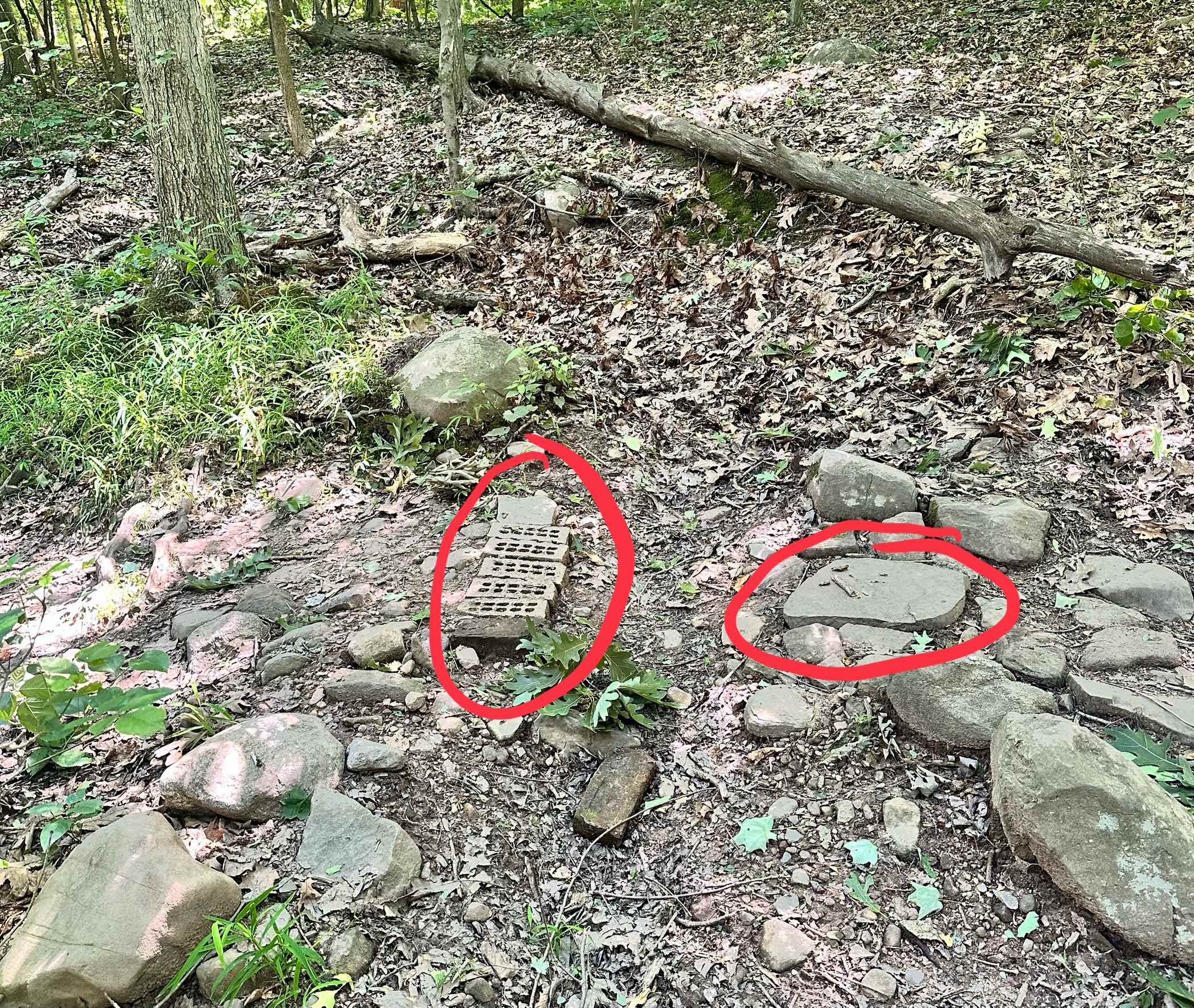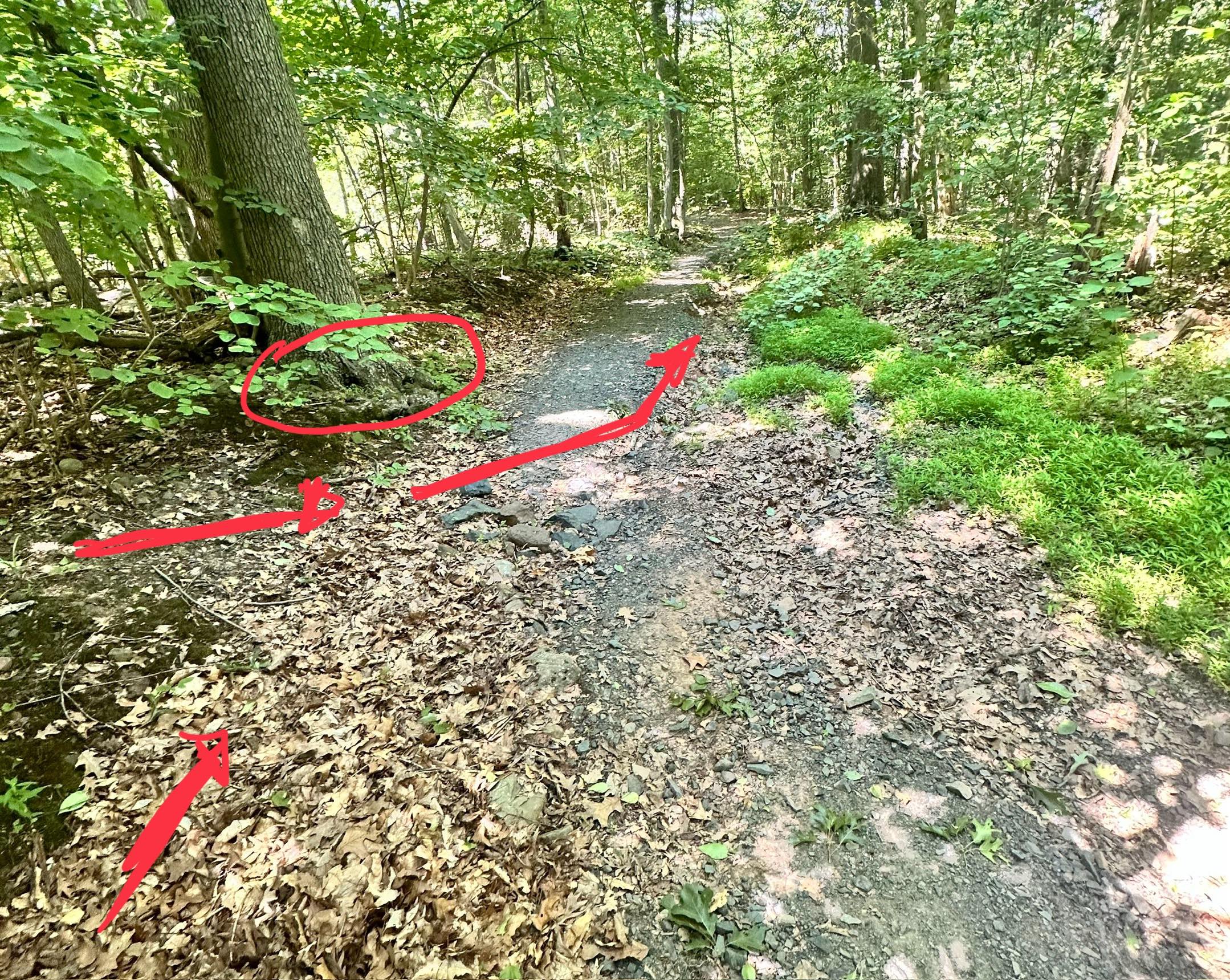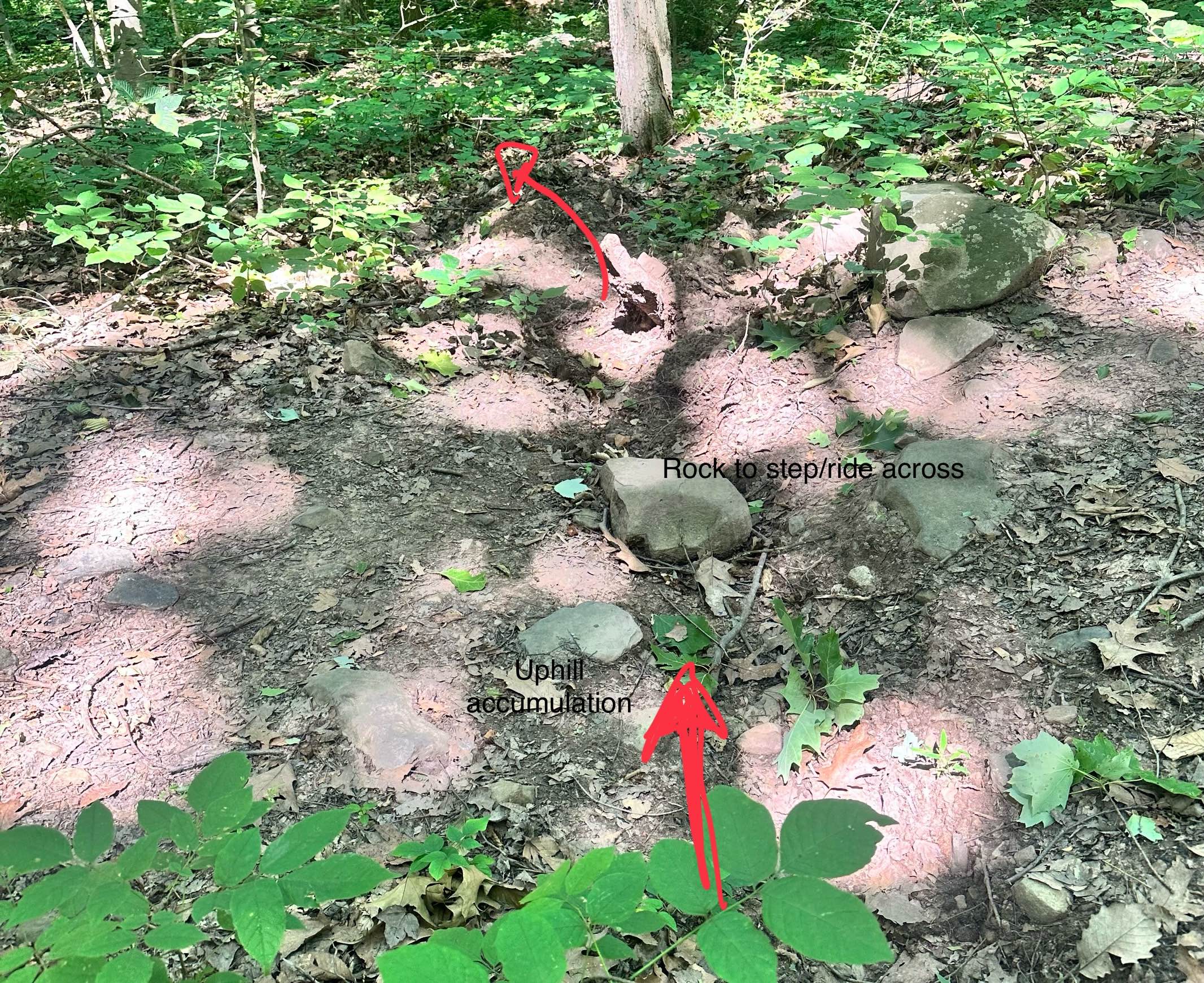 The arms of the “Y” collector (drainage swales) should be sufficiently off the trail to not be a tripping hazard for walkers. They should run downhill – not on a contour. They should be a straight as possible. They will likely have vegetation over time or be filled with leaves. When constructing – like all off-trail features – they are ideally covered with leaves to mask their presence.