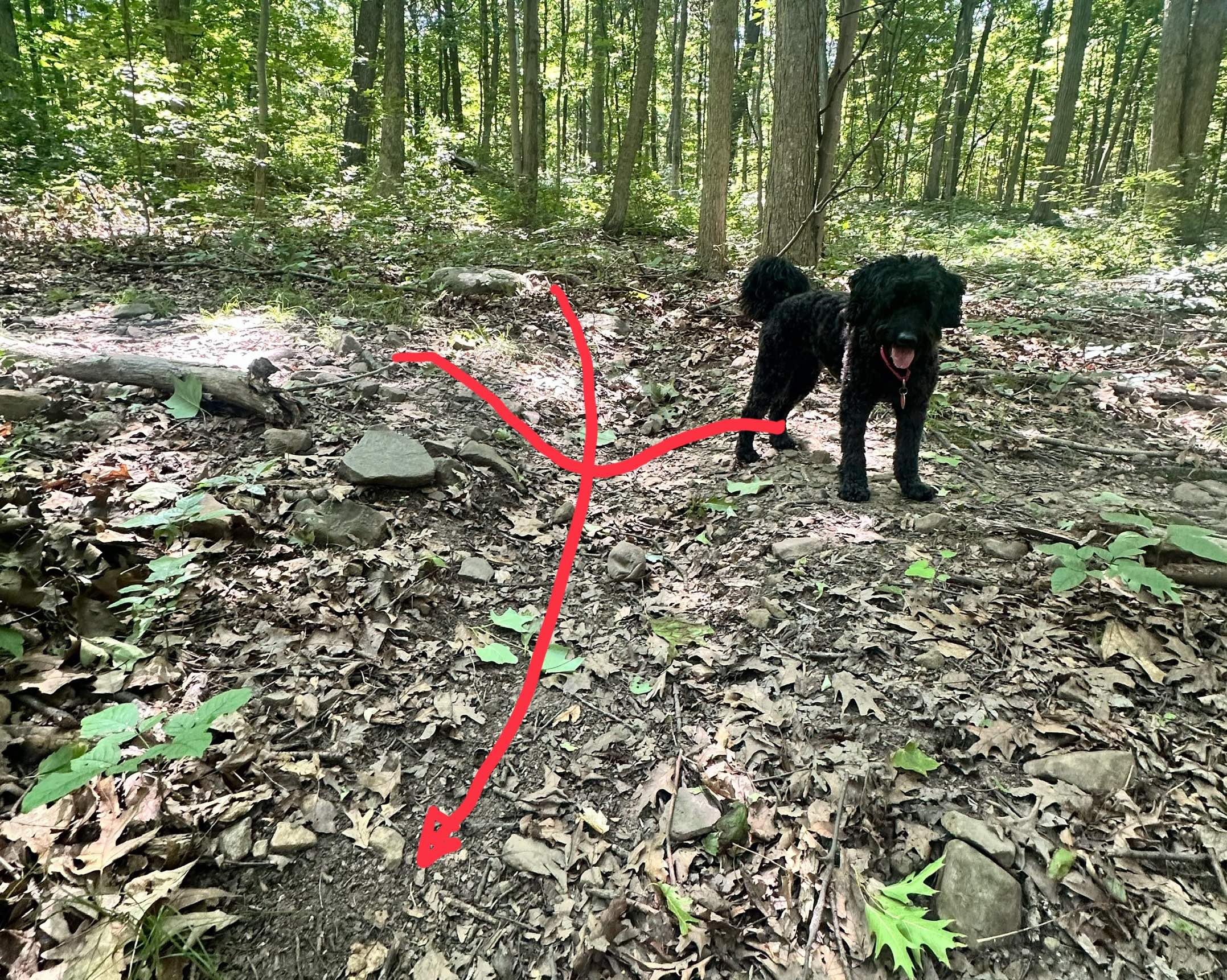 - move any leaves uphill of the intended trail. (These will be used at the end to cover off-trail dirt.)