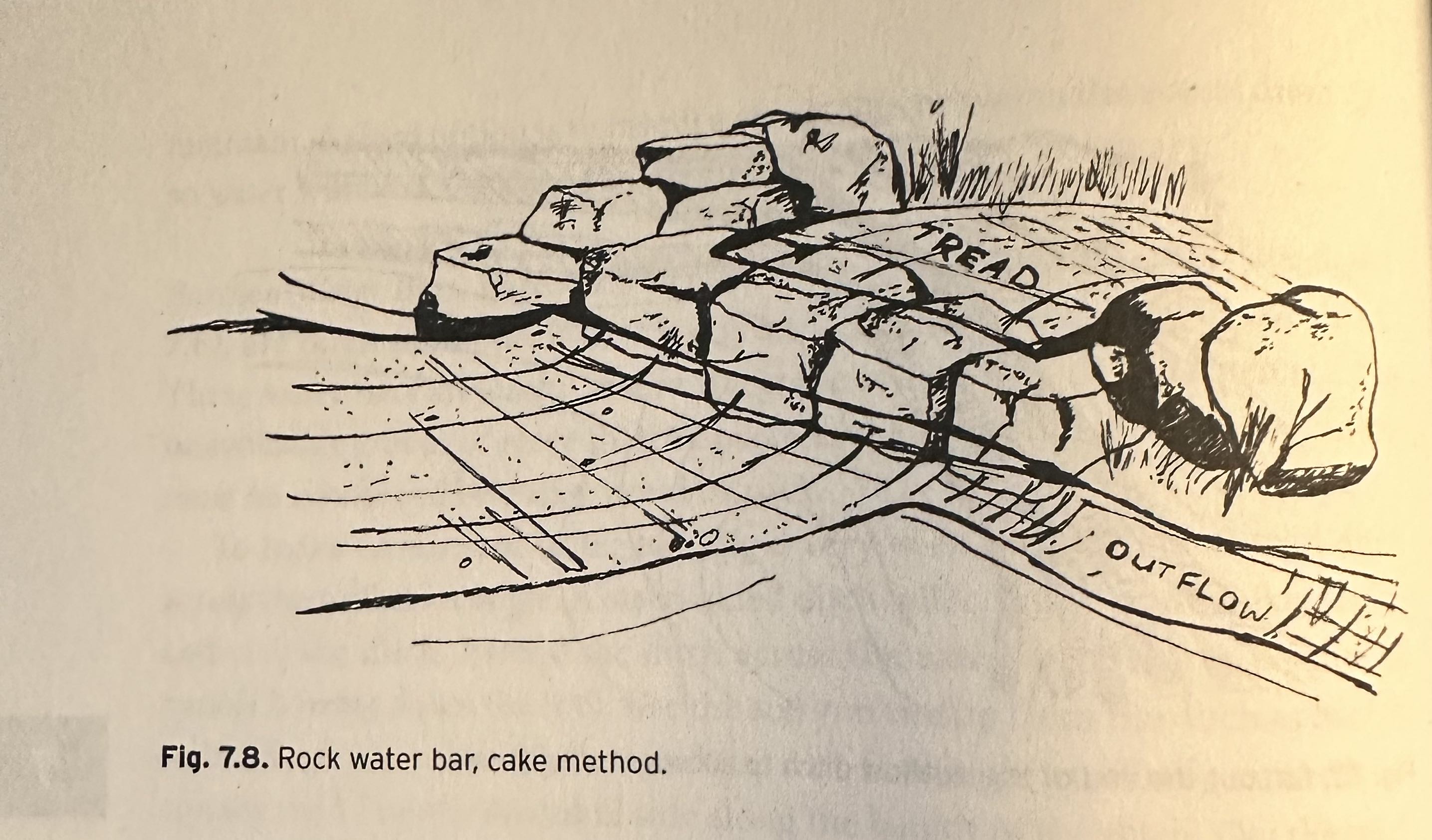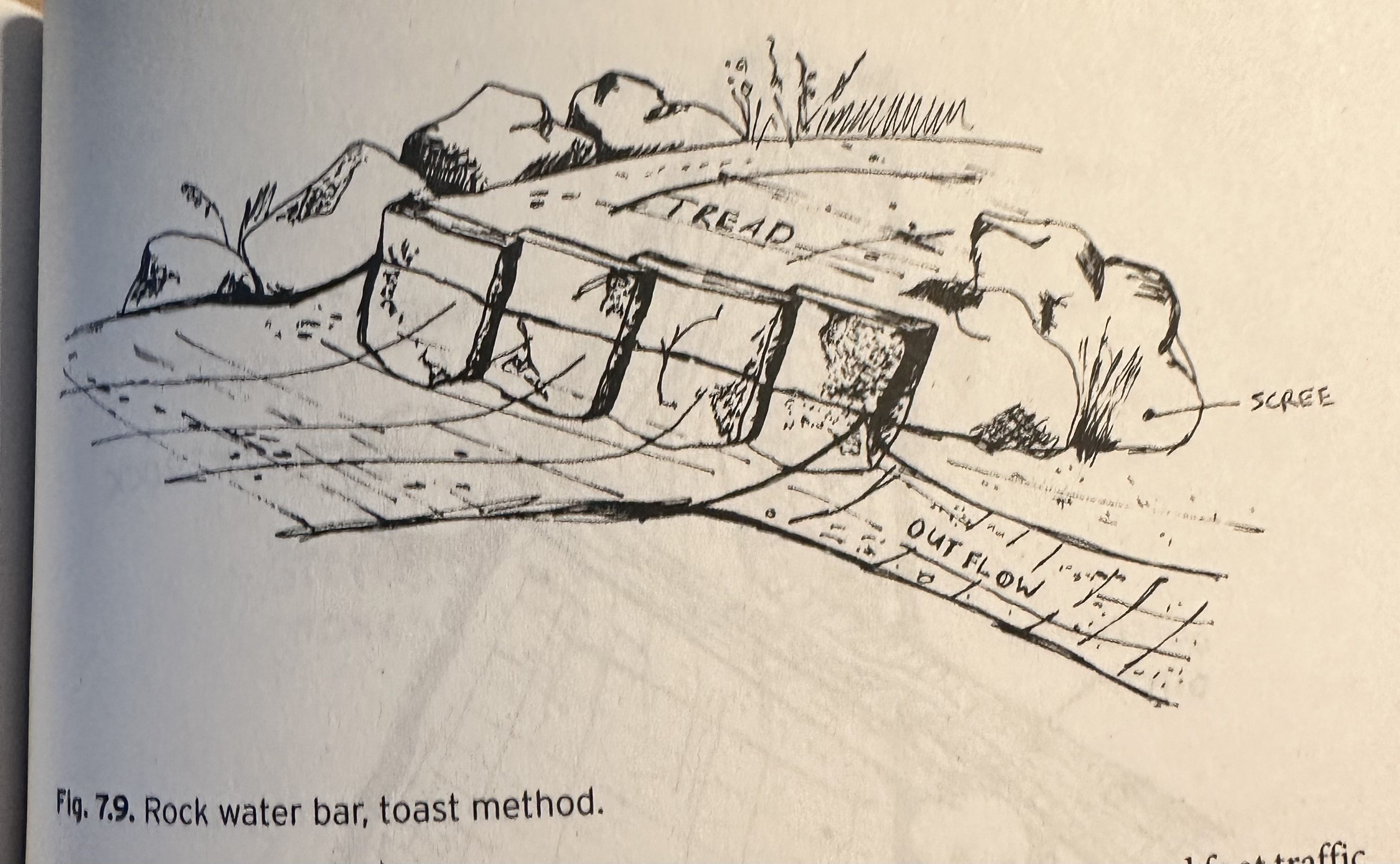 The AMC describes two styles: the cake style where large flat rocks abut each other giving a place to step on the top of the water bar and a flat face for the water to flow across; the toast style uses shingle like rocks (overlapped) and are generally narrower and not meant for stepping on.