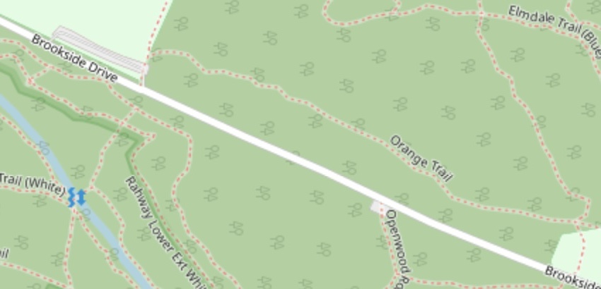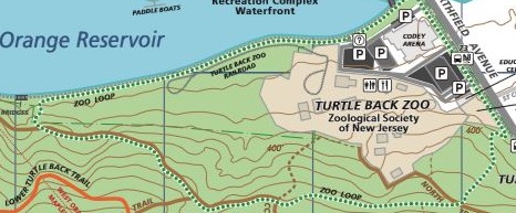 The Mayapple and Turtle Back trails form loops; the Oakdale and Lenape trail; the Elmdale and Dogwood trail form a loop; and the Swampy, Summit, Openwood, Rahway form a loop within the five main areas, partitioned by South Orange Avenue, Northfield Avenue and Brookside Drive and Cherry Lane