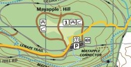 The Lenape trail runs through the Mayapple section and continues northward towards Route 10. An early project was to reroute the trail north of the picnic area. A more recent project was to add an alternate route for the Lenape connecting the Maypple loop to the carriage road that encircle the fields.